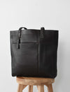 Vintage dark brown leather tote bag. Outer slip pocket. Interior consists of one main roomy compartment, a deep sidewall pocket and one zipper pocket. Made in Columbia.