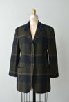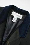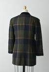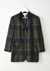 Vintage olive and navy plaid wool blazer with midnight velvet collar. Three button closures. Front pockets. Lightly padded shoulders. Gently tailored fit.