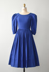 Vintage cobalt blue cotton dress. Puff sleeves finished with two button closures at the cuff. Side zipper. Deep v neckline in back. Full pleated shape through the skirt. Beautiful quality and construction.
