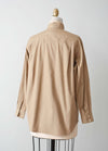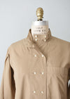 Vintage beige cotton shirt with band collar, two rows of buttons down the front and a single chest pocket. Gently tapered sleeves finished with two button closures at the wrist. Medium weight, smooth crisp cotton fabric.