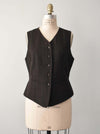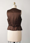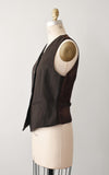 Vintage dark brown wool vest with a subtle pinstripe. Button front. Two lower pockets. Satin fabric though the back. Gently fitted shape.