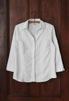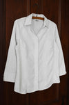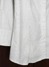 Vintage white cotton blend shirt with embroidered linear swirl designs. Hidden button closures. Light to medium weight fabric.